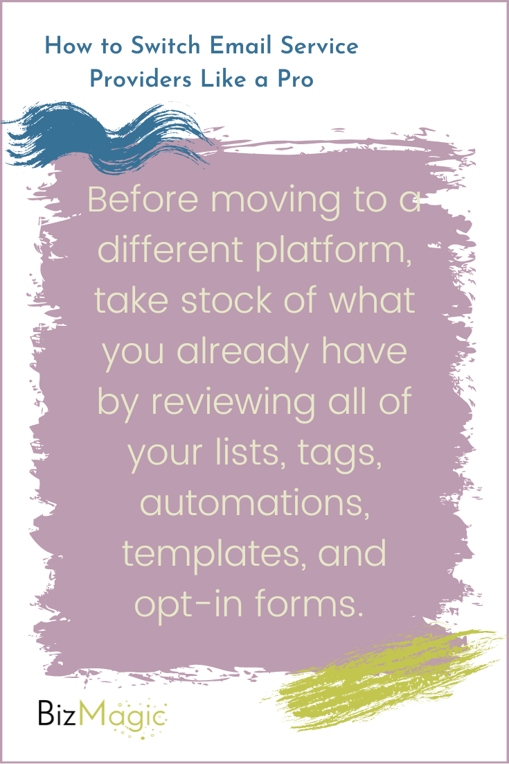 Before moving to a different platform, take stock of what you already have by reviewing all of your lists, tags, automations, templates, and opt-in forms.